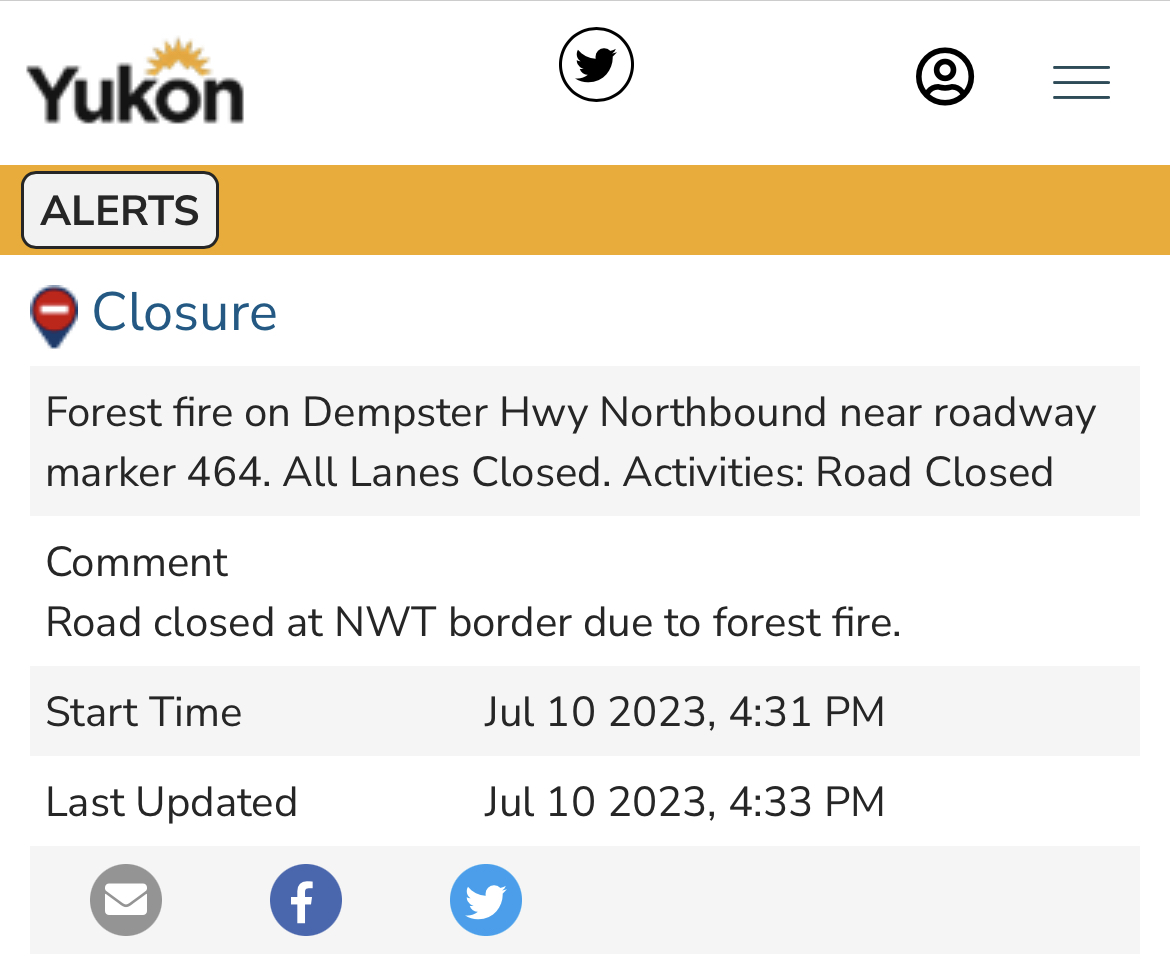 We decided to wait until the Dempster reopened before leaving Tombstone Territorial Park, so we settled down to wait. I took a nap in the afternoon and when I woke up around 5pm I decided to check the Government of Northwest Territories Dept. of Infrastructure Twitter account to see if there was any news: